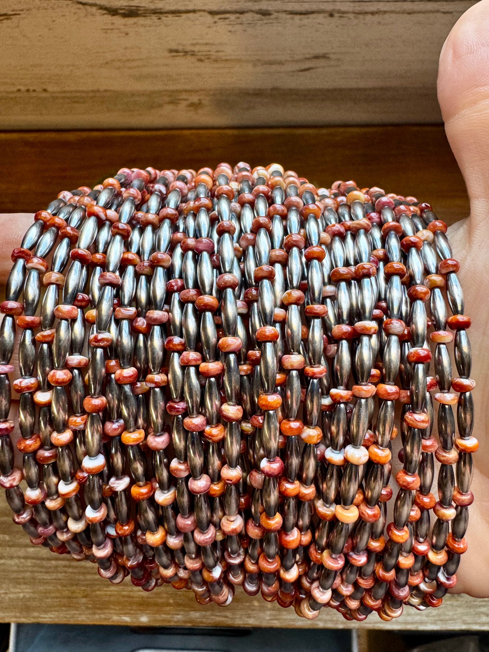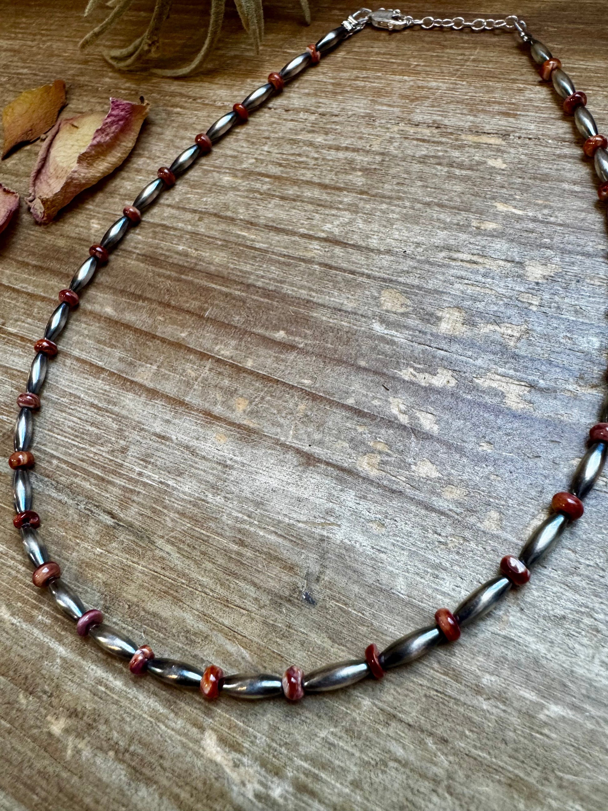 This 14-inch choker is handmade by us in North Texas, featuring our smallest sterling silver torpedo beads (3x9mm)spaced with red and purple spiny oyster heishi.
