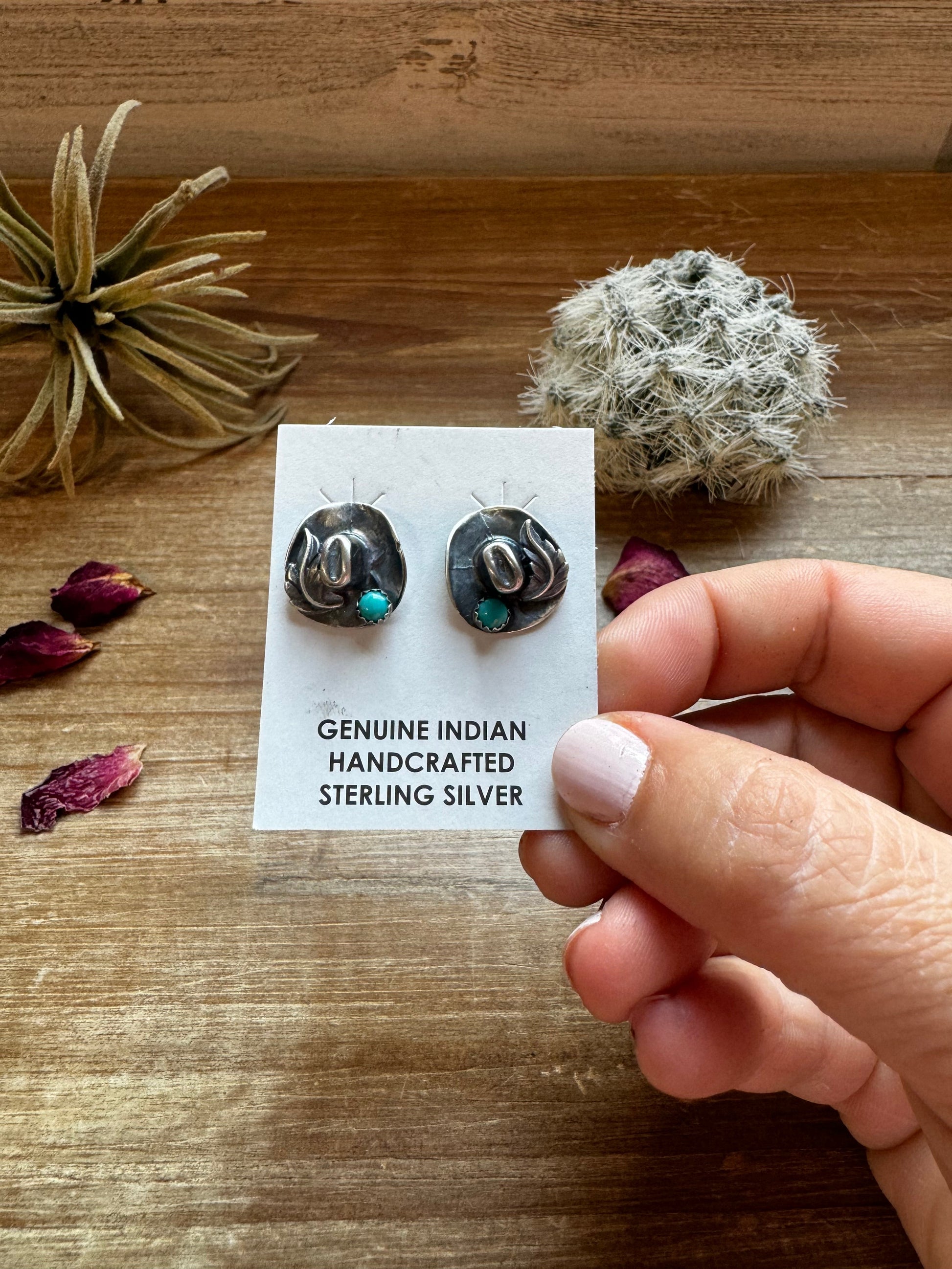 Handmade in the USA, these sterling silver cowboy hat stud earrings feature a Kingman turquoise accent for a unique Western touch. Crafted by Native artisans and stamped sterling for authenticity, each pair carries its own subtle variation due to being man-made. A fun, collectible piece that blends iconic cowboy style with genuine turquoise.